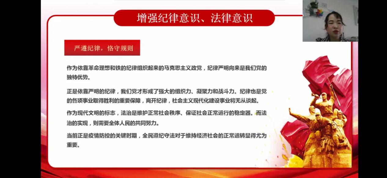 郭嫚老师以“严遵纪律,恪守规则”展开增强纪律意识,法律意识方面的教育,并着重指出,在疫情面前,同学们作为当代青年大学生、作为必赢bwin线路检测中心的一份子,更要身体力行、率先垂范,遵规守纪,自觉配合当地政府和学校的各项防控工作,不得外出和集聚,坚持居家上网课,坚持每天向学校如实报告自己的身体状态和出行动态;未经学校批准,绝不提前返校、不提前返回贵阳市;用自己的实际行动为早日赢得这场战斗的胜利做出贡献。
