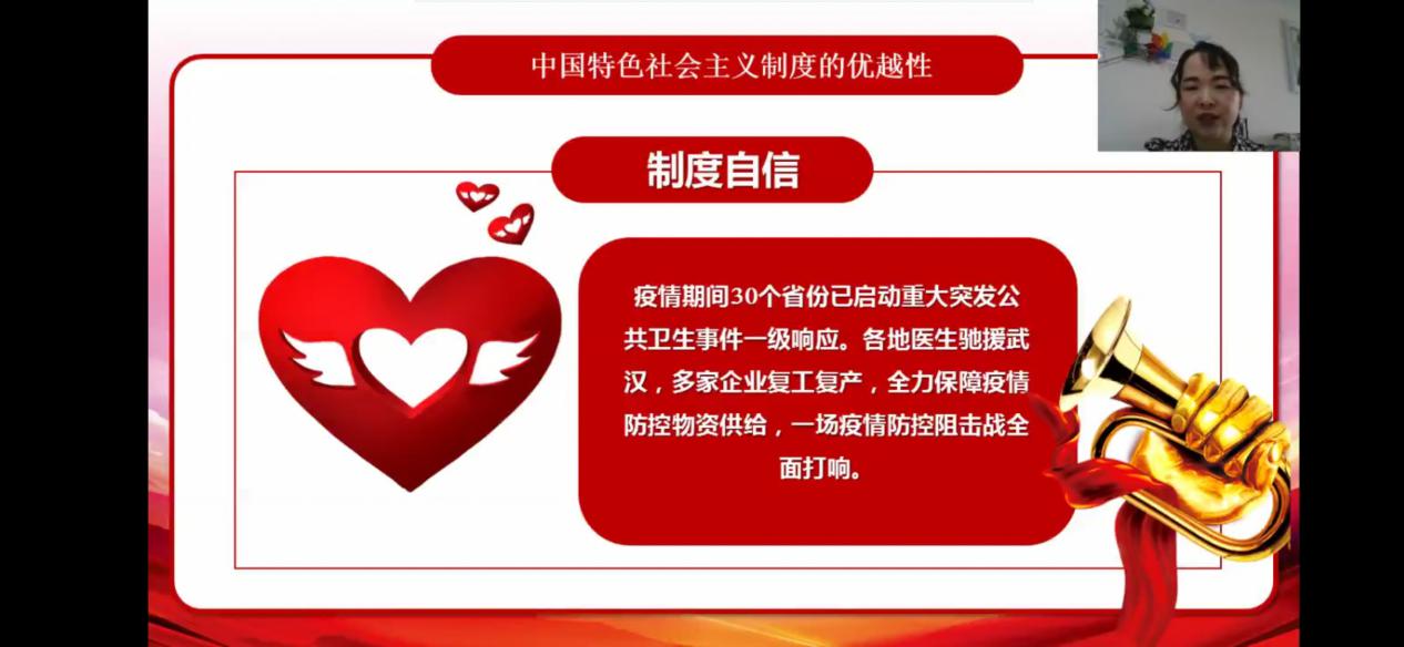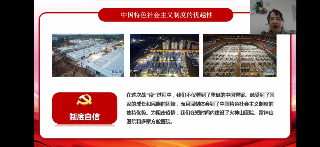 郭嫚老师由战“疫”过程推及中国特色社会主义制度的优越性。让制度自信思想在同学们的大脑中落地生根。中国特色社会主义是当代中国发展进步的根本制度保障,它不仅能够保持党和国家的活力,团结带领全国各族人民攻坚克难、共克时艰,而且能够充分调动广大人民群众的积极性、主动性和创造性,为中国人民谋幸福,为中华民族谋复兴,从而把中国特色社会主义事业不断推向前进。