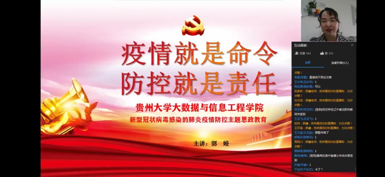 (党政办公室 供稿)为全面贯彻落实习近平总书记关于新冠肺炎疫情防控的重要指示及讲话精神,深入落实立德树人根本任务,切实加强战“疫”时期学校思想政治工作,根据上级部门和学校疫情防控工作部署。2020年3月13日下午,必赢bwin线路检测中心学生科科长郭嫚结合疫情防控工作实际,应用钉钉教育直播平台,以“疫情就是命令,防控就是责任”为主题,围绕党的创新理论教育、爱国主义教育、制度自信教育、社会责任感教育以及纪律规则教育五个方面给必赢bwin线路检测中心全体本科生上了一堂具有特殊意义的网络思政课。全院本科生共1022名,其中参与在线课堂学习学生1143人,针对个别未及时参与学习的同学,学生科也进行了部署安排,要求同学们及时后补进行观看学习。课程学习内容如下: