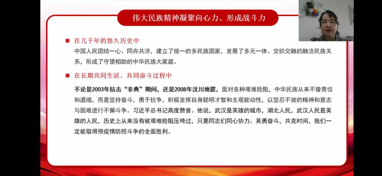 郭嫚老师带领同学们回顾了中华民族的悠久历史,并重点提到不论是2003年非典,还是2008年汶川大地震,以及今天我们所面临的新冠肺炎疫情,面对各种艰难险阻,我们中华民族从来不曾畏怯,而是坚持奋斗,勇于抗争,由此增强同学们抗击疫情必胜的信心,提高同学们的民族意识和爱国情怀,并着重强调:伟大民族精神凝聚向心力,形成战斗力,高举爱国旗帜,方能取得抗击疫情的全面胜利。