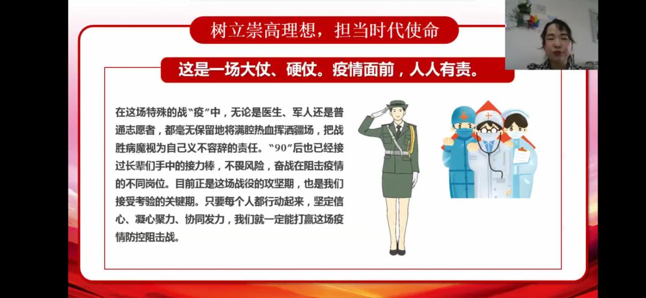 习近平总书记指出:青年一代有理想,有担当,国家就有前途,民族就会有希望。因此,郭嫚老师在课堂上强调:树立崇高理想,担当时代使命,在这场没有硝烟的战争中,同学们都应该毫无保留地将满腔热血挥洒疆场,把战胜病魔视为自己义不容辞的责任。