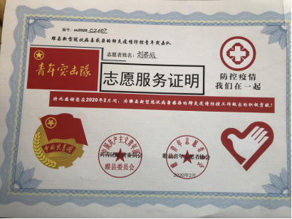 2016级信息与通信工程专业的刘君凤同学是河南省商丘市睢县长岗镇西村的志愿者,主要工作是叮嘱村民尽量不出门,出门带口罩。在村口有车辆进出时做好记录,并排查近期是否有出行武汉并测量体温,体温正常方可放行。