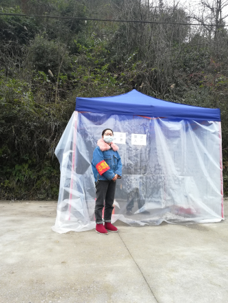 2016级信息与通信工程专业的潘成成在湄潭县复兴镇湄江湖村负责志愿者工作,主要工作是配合村委工作人员在路口进行量体温和出入登记,对外来人员和车辆按规定进行检查,对走亲访友者耐心劝返。