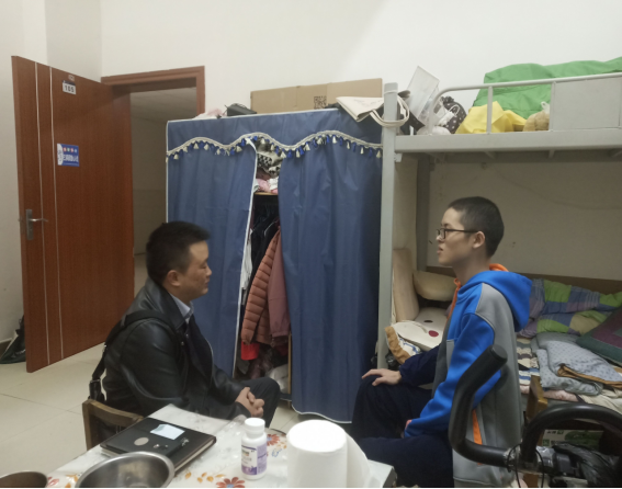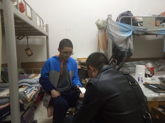 郭应同学长期遭受病痛的折磨,却依然顽强拼搏,与病魔作斗争,坚持学业。当作为师兄的顾果了解到郭应的情况后,毅然决定要帮助这位面临困难的学弟。当他来到郭应宿舍,与郭应进行了简短的交谈,并勉励郭应,要继续坚持,不懈奋斗,未来会越来越好。