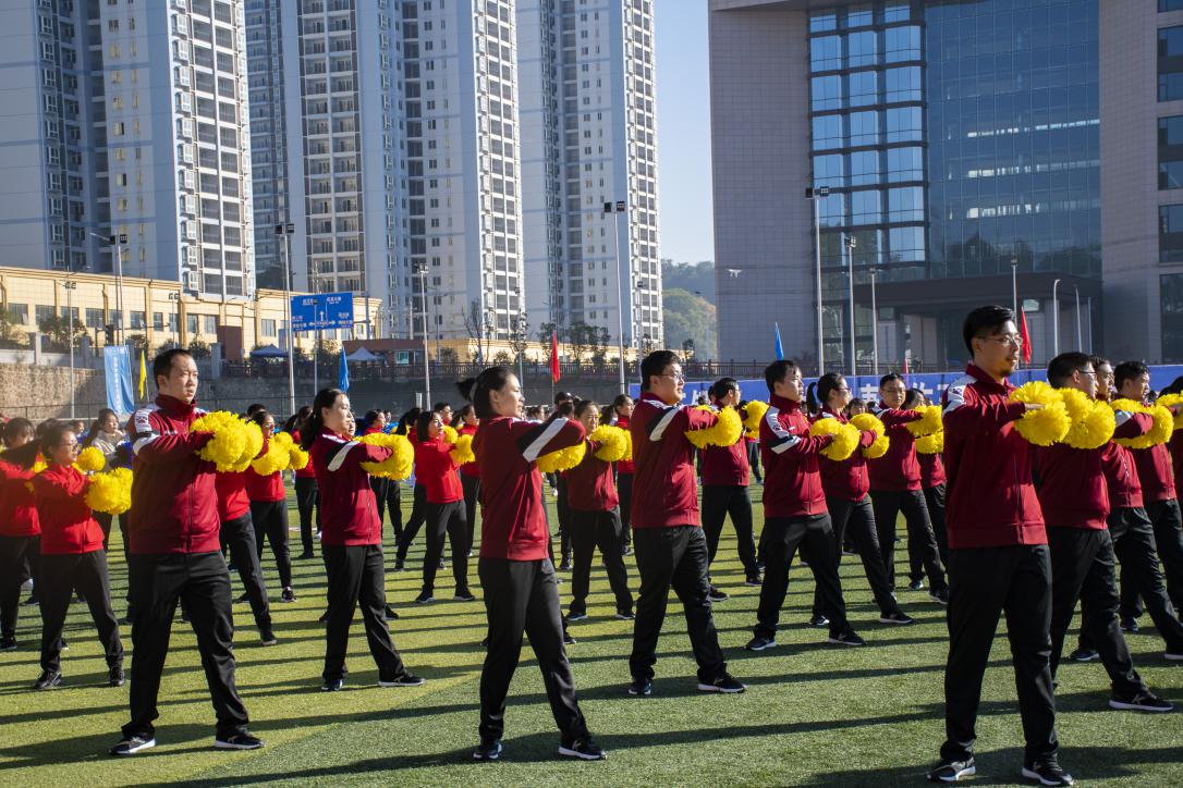 随后,裁判员代表和运动员代表分别带领参赛人员宣誓。校党委书记李建军宣布体育节正式开幕。体育节开场是教职工工间操比赛,各学院组成的比赛队伍着装统一,精神抖擞,动作熟练而流畅,准确而有力。其中大数据学院比赛队员均由教师组成,每位老师都极具团队意识,每天利用午休时间进行练习,只为展现大数据学院的精神风貌。