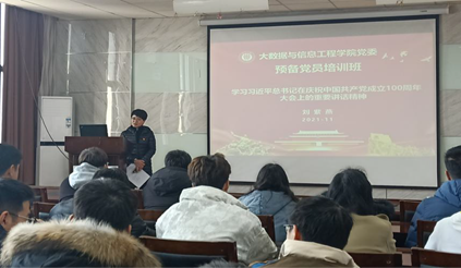 11月30日中午,必赢bwin官网党委委员刘紫燕同志带领预备党员学习了“习近平总书记在庆祝中国共产党成立100周年大会上的重要讲话精神”。刘老师着重强调了中国共产党成立以来的四个时期的不同历史任务以及党团结带领人民创立的四个伟大成就,带领预备党员学习了中国共产党的精神之源、展望了中华民族伟大复兴的九个必须。培训最后,刘老师再次强调习近平总书记在大会上对于青年的殷切嘱托,“新时代的青年人要以实现中华民族伟大复兴为己任,增强做中国人的志气、骨气、底气,不负时代,不负韶华,不负党和人民的殷切期望!”