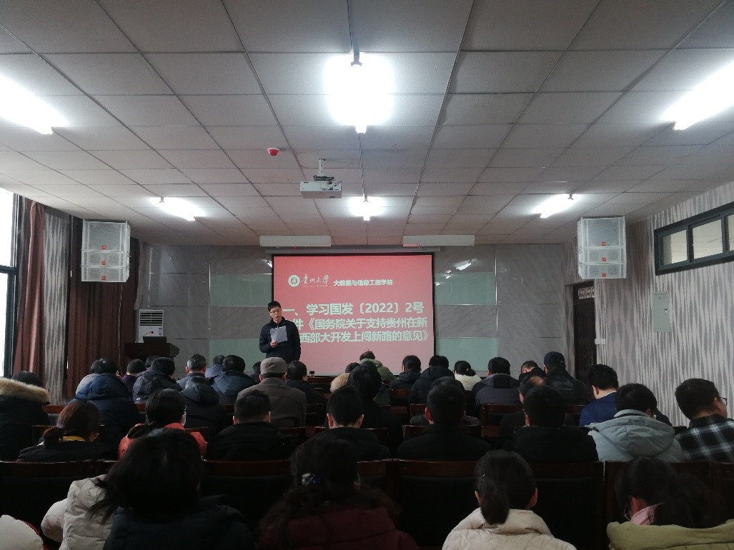 会上,必赢bwin线路检测中心党委书记刘剑领学了《国务院关于支持贵州在新时代西部大开发上闯新路的意见》(国发〔2022〕2号)文件精神;传达了学校2022年春季学期开学工作会议精神及学校2022年工作要点,通报了师德师风方面的相关案例并开展了警示教育。筑牢了教职工拒腐防变的思想防线;加深了教职工对贵州发展及学校重点工作的认识,明确了工作思路和努力方向。