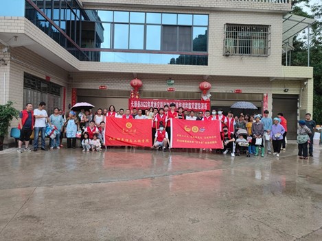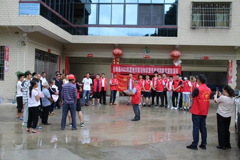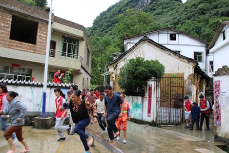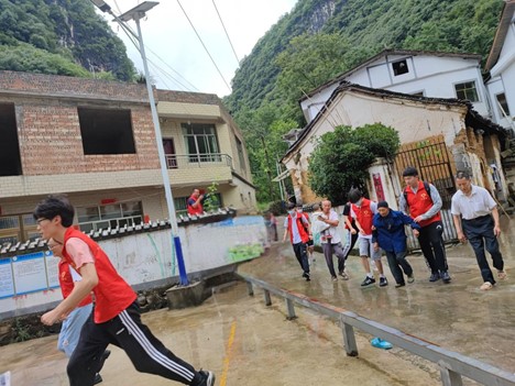 接着,临灾避险演练正式开始。地灾演练以锣鼓声作为灾害发生标志,伴随着阵阵锣声,在威远社区国土所所长的组织下,志愿者的引导下,村民们有序沿制定好的逃生路线撤离至下方空旷的避险场所,演练耗时约三分钟。演练过程,自然资源局工作人员及实践队员各司其职,引导、协助村民逃生,并按照演练程序进行人员清点,确保演练完整和演练实效。演练结束,实践队员向村民们发放了防灾避灾宣传手册及小礼品。邓友刚对演练活动进行总结,对演练中存在的不足进行说明,并再次提醒村民临灾避险的注意事项。