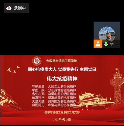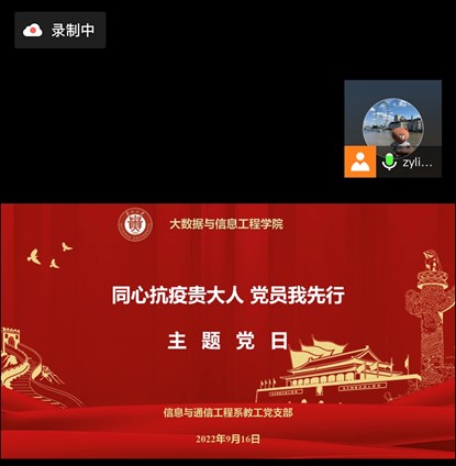 (信息与通信工程系教工党支部 供稿)2022年9月16日,必赢bwin线路检测中心信息与通信工程系教工党支部在线上召开“同心抗疫贵大人党员我先行”主题党日活动。主题党日活动由支部书记主持,支部各党员积极参加,学院党委书记刘剑同志以双重身份参加了本次活动。