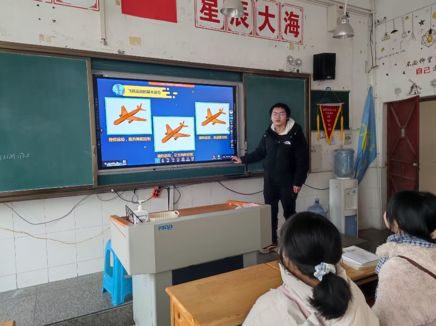 在庄严的国歌声中,讲座拉开帷幕。首先,科普队员明确我国的领土主权神圣不可侵犯,不容商讨,不容践踏!我国的领空范围包含领土范围960万平方公里和领海范围470万平方公里,习近平主席曾说过:“我们绝不允许任何国家、任何组织、任何政党、在任何时候、以任何形式、把任何一块中国领土从中国分裂出去。”祖国的领土一寸也不能丢失!随后,队员们回顾了中国航天发展史,这是一部中华民族自主创新的历史,一段扬眉吐气、壮我国威,助推中华民族走向世界舞台中央的历史。先辈们的吃苦耐劳,勇于奋进,团结一心的航空航天精神在科普队员的讲解下,变成一颗种子扎根进每一个倾听者的心中。最后,科普队员为同学们科普了航天与象山的渊源、飞机的飞行姿势、飞机的起飞原理等等有趣的知识,也回答了关于一些航空航天的知识,比如航天员是如何在太空中生活的。每个人都在认真听讲,勤做笔记,踊跃提问,表达了对航天知识的浓厚兴趣与无线的憧憬。